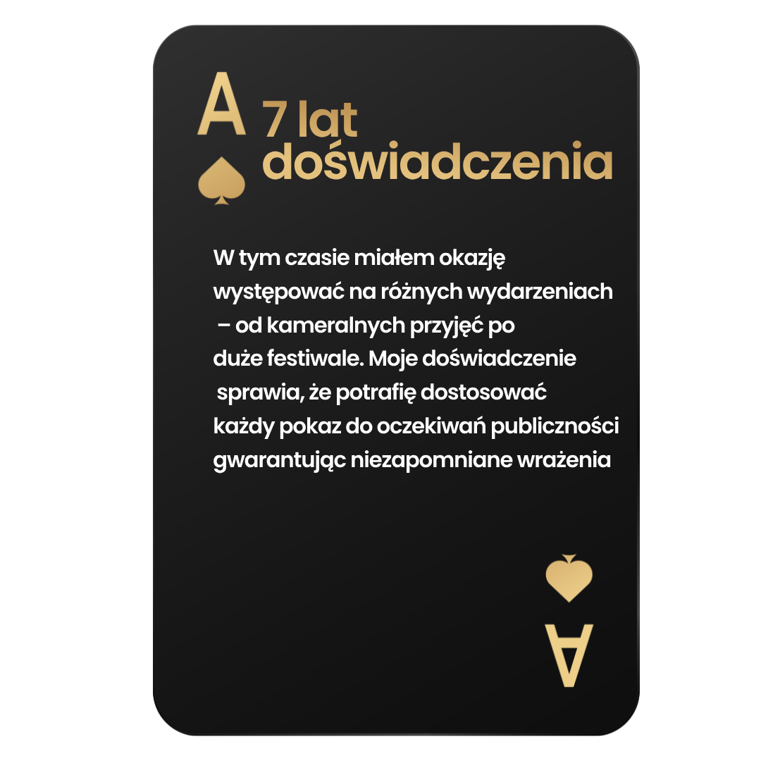 Wierzę, że iluzja to coś więcej niż oszukiwanie wzroku – to budowanie emocji i wspólnego doświadczenia. Od ponad 8 lat zmieniam zwykłe spotkania w magiczne wspomnienia. Moim celem nie jest pokazanie 'jak to zrobiłem', ale sprawienie, by Twoi goście poczuli się wyjątkowo i świetnie się bawili.